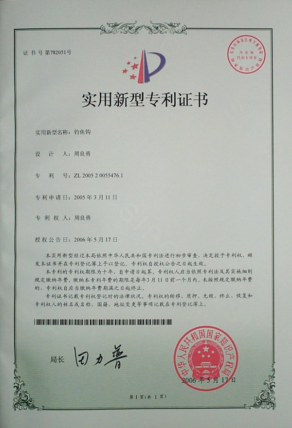 按照周良勇说法,在钓鱼时,鱼往往把饵料都吃光了还不上钩,这是因为鱼很难将整个包住鱼钩的饵料吞进口中,只能一点一点吃。他发明的专利鱼钩在钓鱼时呈水平状态,鱼在吃饵料时很容易就会把鱼钩吃进口中,这样可以大大提高钓鱼的效率和趣味性。