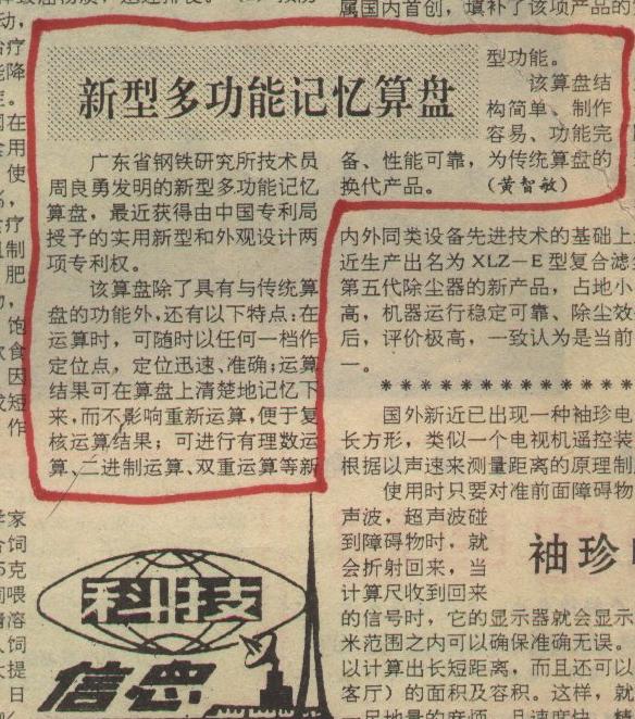 广东省钢铁研究所技术员周良勇发明的新型多功能记忆算盘,最近获得由中国专利局授予的实用新型和外观设计两项专利权。 该算盘除了具有与传统算盘一样的功能外,还有以下特点:在运算时,可随时在任意一档上标出定位点,定位迅速、准确;运算结果可在算盘上记忆下来,而不影响重新运算,便于复核运算结果;还可进行有理数运算、二进制运算、双重运算等。 该算盘结构简单、制作容易、功能完备、性能可靠,是传统算盘的换代产品。