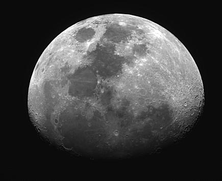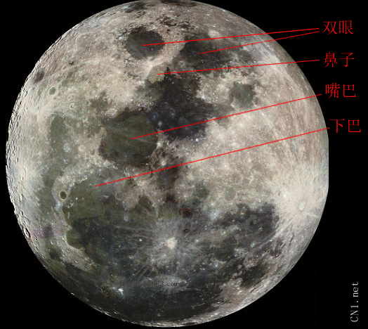 “月中人”的眼睛由“雨海”和“澄海”构成,鼻子由“暑湾”构成,嘴巴是由“云海”和“知海”构成的。这些“海”和“湾”占据了月球的六分之一,主要朝向地球。 |