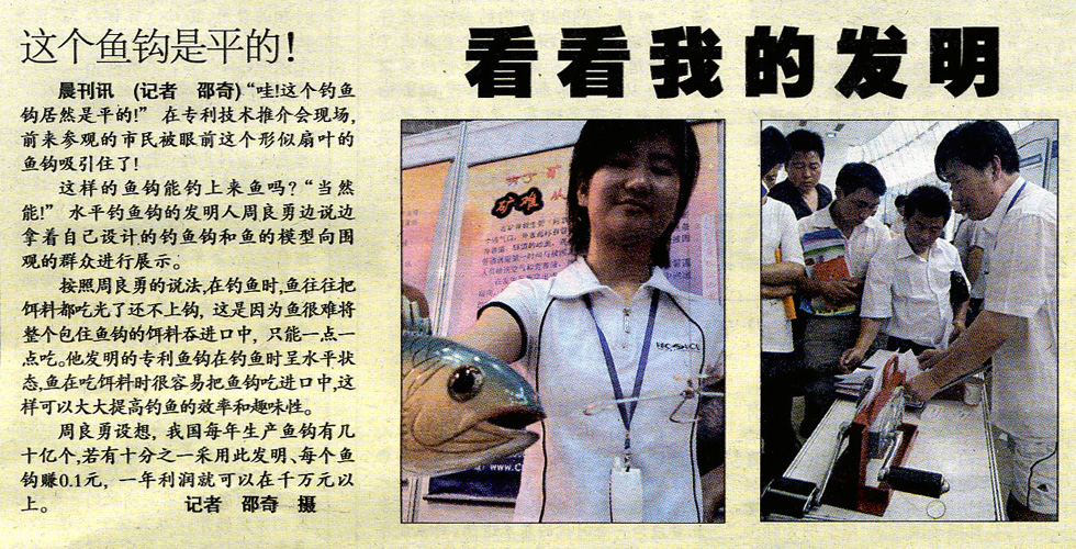 晨刊讯 (记者 邵奇)“哇!这个钓鱼钩居然是平的!”在专利技术推介会现场,前来参观的市民被眼前这个形似扇叶的鱼钩震惊了!