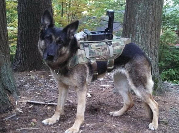 警方可以遥控警犬带着摄像机进入丛林,悄悄跑到恐怖分子和毒贩们藏身的营地进行侦察,实时传回画面。