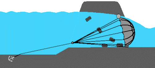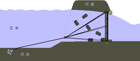 利用铁锚(万吨轮船用的船锚)对大地的抓着力来拉住放在溃口处的堵溃器(堵溃伞、堵溃网、堵溃架),或者拉住堵溃船(就象是拉住万吨巨轮一样),堵溃器把抛投下的沙包挡住(可以做成有骨架的网状,使它只挡住沙包而让水流过,以减小水流的冲力),这样每一个沙包都能起它应有的作用,而且只要用沙包这样的廉价填料即可,无需几十吨重的混凝土块或沉车沉船。当沙包越积越多时,溃口(或截流龙口)便被逐渐堵上。