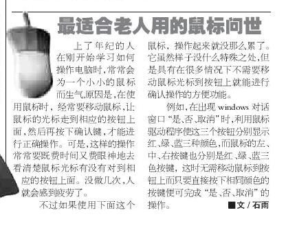 现有的鼠标器在使用中需要进行确认操作时,须将鼠标光标移到相应的按钮(或称控件)上面,然后按下确认键(一般是左键)才能进行确认操作。例如,很多软件在使用中都会出现有“确定”、“取消”、“帮助”这三个按钮的对话窗口,这时候必须把鼠标光标移到窗口中相应的按钮上才能确认,鼠标光标在按钮以外的任何地方时按下按键都不起作用,只会听到错误操作的系统提示音。这种鼠标器及其操作方法的不足之处:一是花费时间(须将鼠标光标移到相应的按钮上面),二是花费眼神(需看清楚鼠标光标有没有对到相应的按钮上面)。 本发明提供了一种在很多情况不需要移动鼠标光标到按钮上便能进行确认操作、使用起来十分方便的鼠标器。 例如,在出现windows对话窗口“是、否、取消”时,利用鼠标驱动程序使这三个按钮分别显示 三种颜色,而鼠标的左、中、右按键也分别是红、绿、蓝三色按键,这时无需移动鼠标到按钮上而只要直接按下相同颜色的按键便可完成“是、否、取消”的操作。 本发明鼠标器在使用过程中,由于在很多情况下都无需移动鼠标光标(到按钮上)便可进行确认操作,因而比用现有鼠标器可以节省时间,提高效率,其梦幻般的外观更是人见人爱,另外也为各种软件的开发使用提供更好用的鼠标器硬件环境。